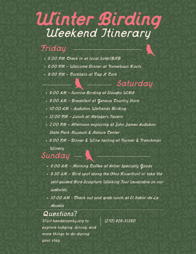 To make the most of your winter birding expedition. We’ve laid out the perfect Henderson Itinerary for your trip!
