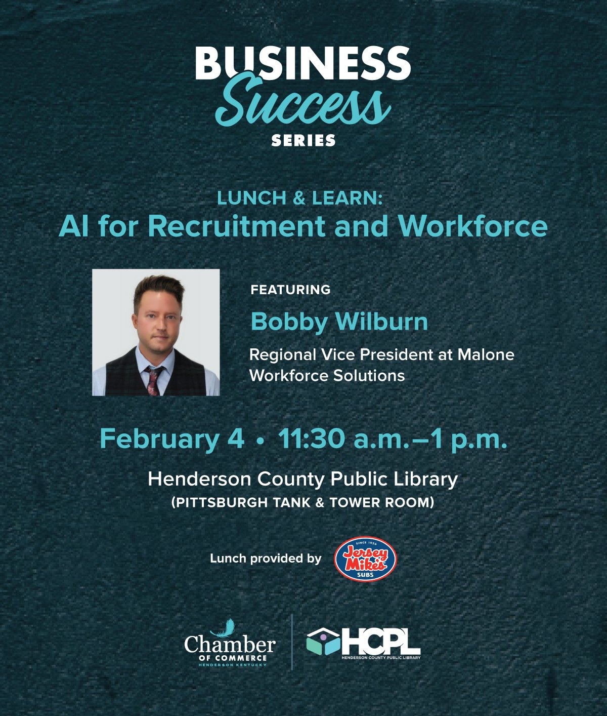 Community Events, Featured EventsHenderson County Public Library 101 S. Main St., Henderson, KY, United StatesJoin us for the first Lunch & Learn of 2026 and the kickoff of our Business Success Series on Wednesday, February 4th, 2026, from 11:30 a.m.–1:00 p.m. This session will feature Bobby Wilburn, Regional Vice President with Malone Workforce Solutions, and will focus on AI tools for recruitment and workforce. Bobby will provide an overview…