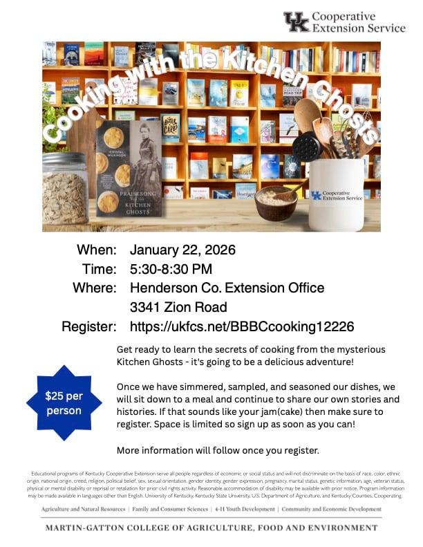 Community Events, Featured EventsHenderson County Cooperative Extension Expo Building 3341 Zion Road, Henderson, KY, United StatesGet ready to learn the secrets of cooking from the mysterious Kitchen Ghosts - it's going to be a delicious adventure! In this class, we will prepare recipes from "Praisesongs for the Kitchen Ghosts," written by Crystal Wilkinson. As we learn to prepare these multi-generational dishes, steeped in Kentucky history and culture, we will continue to revisit…